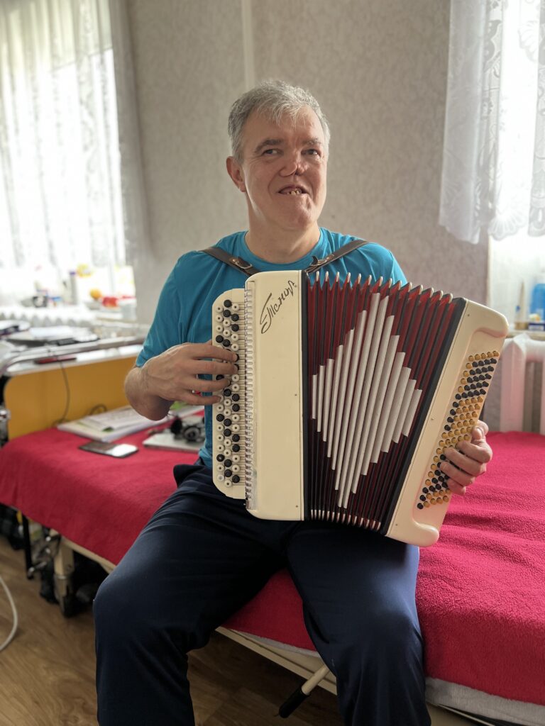 The Stasinets have been in this asylum since the first days of the war. Both have different forms of cancer and degrees of disability. Vasile endured 11 operations, but he came to the Republic of Moldova with the accordion. It is a thread overflowing with optimism. He likes painting. He looks at the file ahead, with keen eyes and full of courage.